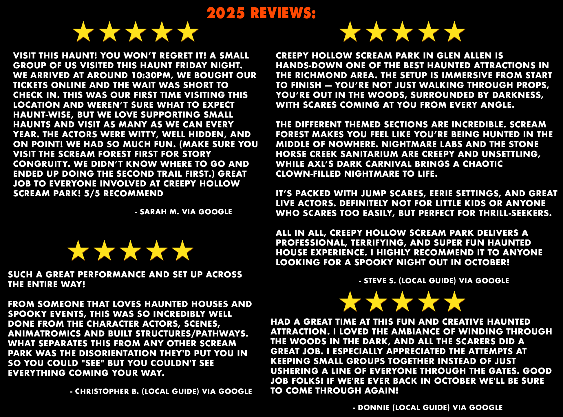 Creepy Hollow Scream Park is Richmond's Ultimate Halloween destination, with more monsters, more frights and more fun! Each night we have live actors, monsters, incredible animatronics, amazing illusions and acres of screams. Join us for Richmond's legendary Haunt! We are located just 10 minutes from Short Pump, open select nights in October.